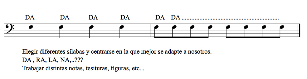 Ya que tenemos distintas sílabas, (RA-DA-LA-NA…) lo mejor es utilizar la que mejor se adapte a cada uno de nosotros y centrarse en perfeccionarla en una misma nota y en diferentes tesituras. Para mí la mejor es la sílaba DA, pero como decía antes cada uno debe elegir la que de mejor resultado.