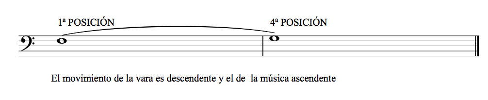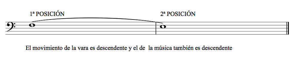 El tercer tipo de ligado sería el que se consigue gracias a la articulación especial que conseguimos con la utilización de ciertas articulaciones con la lengua. En este caso y al contrario que el segundo tipo de ligado, la música y la vara se moverían en la misma dirección. Si queremos tocar el fa de la 4ª línes del pentagrama y a continuación el mi del 3º espacio del pentagrama, la música es descendente y también la vara se mueve descendentemente.